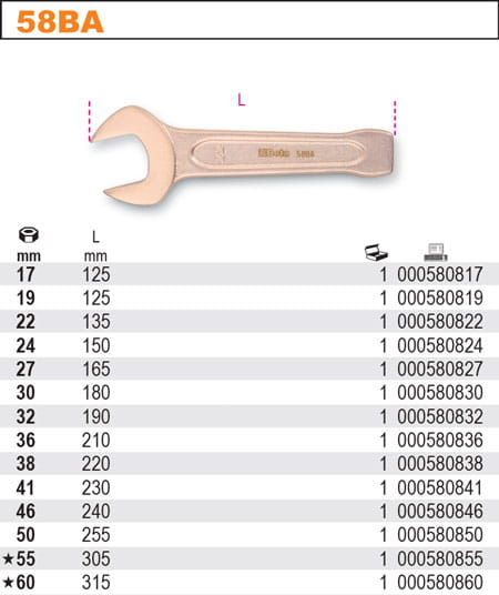 Klucze płaskie jednostronne do pobijania nieiskrzące, ze stopu miedzi i berylu